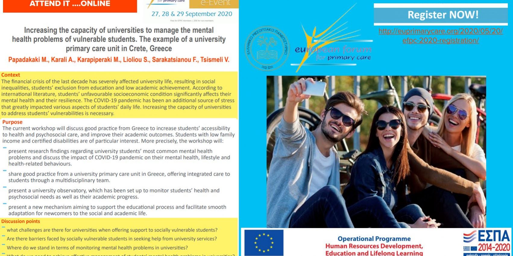 Σεπ232020Νέα Κάνε εγγραφή και Παρακολούθησε ONLINE το στρογγυλό τραπέζι για τη Μοναδα Πρωτοβάθμιας Φροντίδας Υγείας του ΕΛΜΕΠΑ.Registration: http://euprimarycare.org/2020/05/20/efpc-2020-registration/ Category: ΝέαBy Evangelos Melidonis23 Σεπτεμβρίου 2020 Author: Evangelos Melidonis Post navigationPreviousPrevious post:Έρευνα με θέμα τις κρίσεις και στάσεις ως προς τον κορωνοϊόNextNext post:ΠANΔΕΚΤΗΣ Κατεπειγόντων Ρυθμιστικών ΜέτρωνRelated PostsΗ ισότητα των φύλων στο Ελληνικό Μεσογειακό Πανεπιστήμιο26 Φεβρουαρίου 2023Νέες υπηρεσίες στο Κέντρο Εκπαιδευτικής Υποστήριξης (ΚΕΚΠΥ) του ΕΛΜΕΠΑ24 Φεβρουαρίου 2023Πρόγραμμα οικονομικής ενίσχυσης φοιτητών που ανήκουν σε ευπαθείς κοινωνικές ομάδες29 Νοεμβρίου 2022Ημερίδα: Οι Υπηρεσίες Κοινωνικής Μέριμνας στην Τριτοβάθμια Εκπαίδευση: Το παρόν και το μέλλον24 Νοεμβρίου 2022ΣΥΝΕΧΙΣΗ ΣΥΝΕΡΓΑΣΙΑΣ ΜΕ ΤΗΝ ΚΙΝΗΤΗ ΜΟΝΑΔΑ ΗΡΑΚΛΕΙΟΥ ΤΟΥ ΚΕΘΕΑ ΑΡΙΑΔΝΗ9 Νοεμβρίου 2022ΕΝΤΥΠΟ ΚΑΤΑΓΡΑΦΗΣ ΑΝΑΓΚΩΝ1 Νοεμβρίου 2022